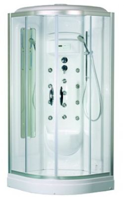Гидромассажная кабина. Система управления EasyPad, 12 вертикальных форсунок Active Jet с режимом работы форсунок – AMPM, 3 форсунки для плеч, верхний душ, ручной душ, подсветка, сенсорный пульт, радио, вентилятор, паровая баня с цифровой системой управления, смеситель с переключателем, полочка для шампуня, зеркало, сьемная юбка поддона, цвет профиля – матовый хром, цвет стекла – прозрачное