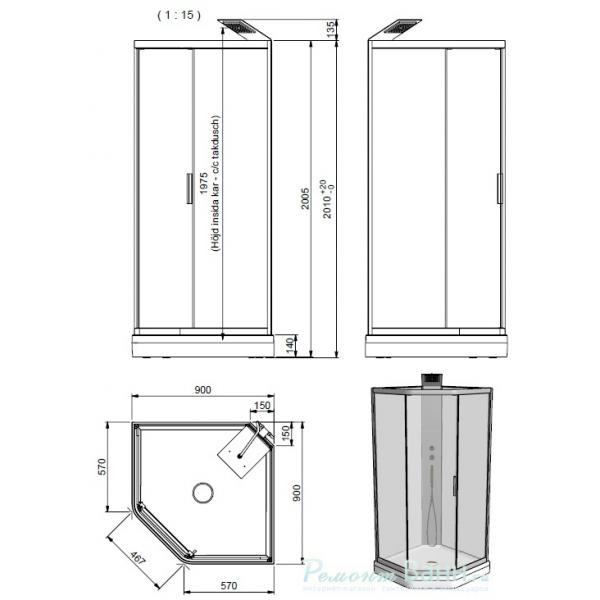 Высота с поддоном 2 145 - 2 165 мм к верхнему краю установленного душа,
