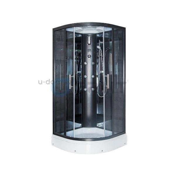 | Тип душевая кабина Форма 1/4 круга Крыша есть Задняя стенка стекло (зеркальное) Центральная стойка есть (пластик, черный) размеры:100х100х215 |