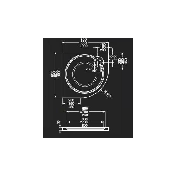 Низкий полукруглый поддон радиусом R-550 мм. с 5 ножками 8+10 см. в комплекте.