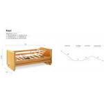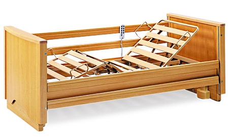 Матрасная основа со стальными ламелями (легко обрабатывается дезинфицирующими средствами) — 4х секционная с регулировкой высоты от 40—80 см и наклоном ножного конца. Электропривод «Dewert» (Германия), пульт дистанционного управления с возможностью блокировки клавиш магнитным ключом. Подвижные боковые ограждения. Двойные колеса «Tente» 50 мм скрытые в корпус кровати с центральной блокировкой. Ножная секция дополнительно регулируется вручную (механизм Rastomat). Возможность экстренного опускания головной секции (отключение электричества). В комплектацию кровати входят поролоновый матрас с чехлом на молнии и устройство (дуга) для приподнимания.