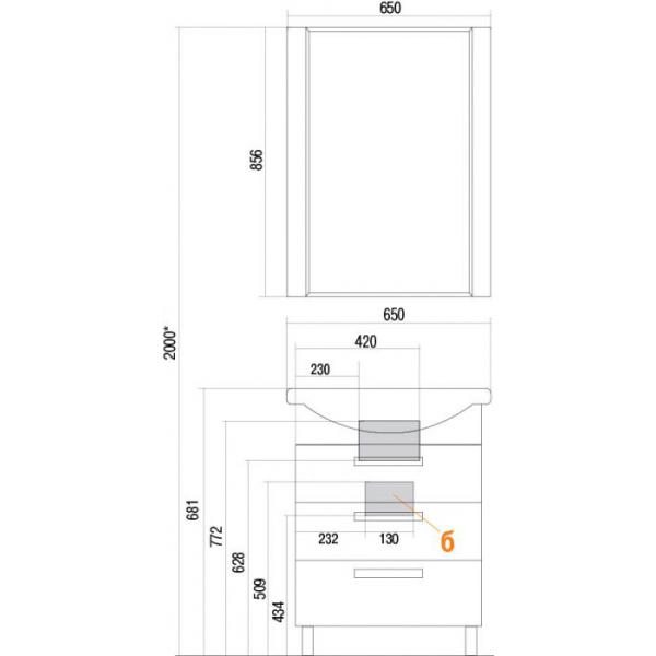 Комплектация: Ручки - 3; ящики из ВДСП «дуб молочный» - 3; шариковые направляющие; навесы - 2; ножки – 2; раковина «Лагуна» 65 арт. 6531