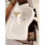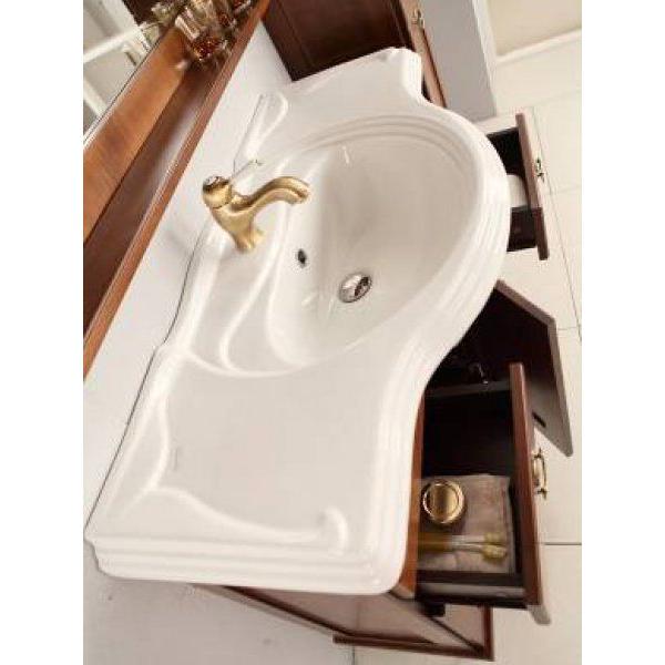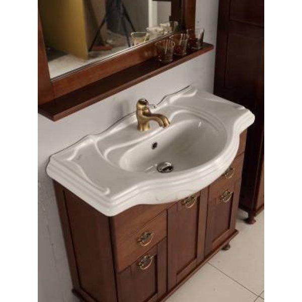 В наши дни популярность классического стиля в интерьере с каждым днем растет. Коллекция «Наварра» воплощение лучших его особенностей. Классическая корпусная мебель никогда не мирилась с сочетанием второсортных материалов, поэтому для воплощения этой коллекции в жизнь используются натуральные отделочные материалы из массива и лучшая лицевая фурнитура из Италии. Очарование респектабельности создает эксклюзивный дизайн керамической раковины от Итальянского производителя «Gravena». Безусловно, удобна глубина ее чаши и широкая поверхность по бокам, где можно разместить необходимые аксессуары для ванной комнаты. Неоспоримая функциональность тумбы в ее внутренней организации. Два небольших выдвижных ящика вместят в себя множество мелочей. Они оснащены шариковыми направляющими, что обеспечивает их плавное движение. Вещи большего размера можно спрятать в полки за любым из трех фасадов. Для открывания фасадов в изделиях данной коллекции применяются петли только с интегрированной системой плавного закрывания от ведущего европейского производителя – компании «Blum». Большое зеркало с полкой обрамлено в раме строгой классической формы. Оно комплектуется двумя навесными светильниками в классическом стиле. Лицевая фурнитура от одного из лучших европейских производителей фурнитуры Bozetti-Marella подчеркивает общий стилистический образ этой коллекции мебели. Комплект мебели можно дополнить вместительной колонной с двумя ящиками и фасадами с полками.
