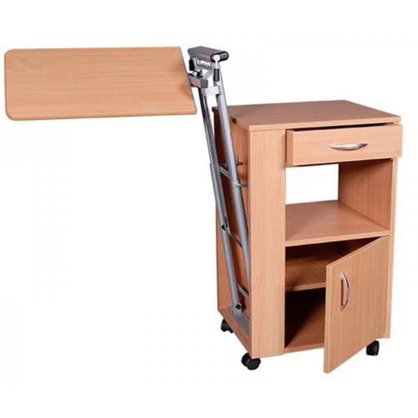 Прикроватная тумба с выдвижной поворотной столешницей Rubens 2 подходит для использования в стационарных отделениях, а также для ухода за больными в домашних условиях. Благодаря отделки под "бук" тумба с легкостью впишется в любой интерьер. Корпус тумбочки имеет двери с двух сторон, ящик также может выдвигаться с разных сторон, это позволяет использовать ее любой стороны кровати. Сбоку установлен складной столик, при необходимости его легко можно установить, а затем убрать. Столик регулируется по высоте, а столешница регулируется по наклону. Для удобства транспортировки тумбочка оснащена четырьмя колесами, два из которых имеют блокировочный тормоз.