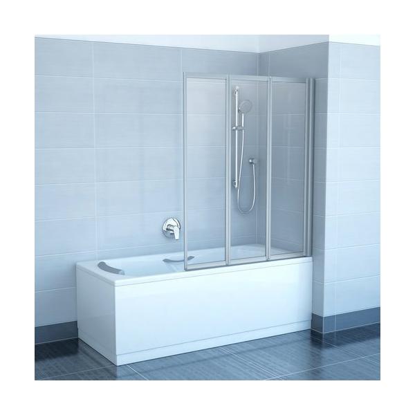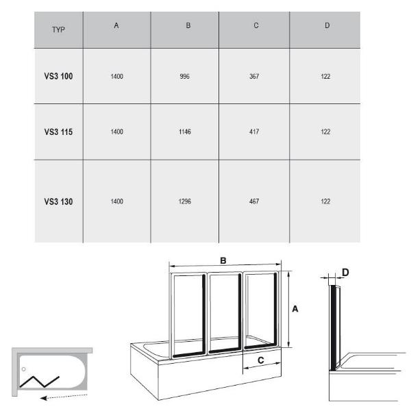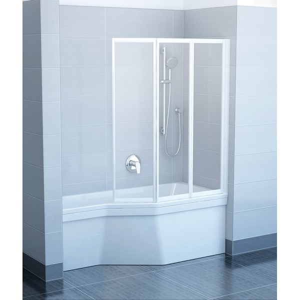 Конструкция представляет собой три подвижные части, которые складываются вовнутрь ванны. Последняя часть шторки, складываясь вовнутрь, образует частично закрытое душевое пространство. Также особенностями шторки Ravak Supernova VS3 являются простая и быстрая установка, она крепится несколькими винтами в стену, и универсальная ориентации. Путем переворота шторка может устанавливаться как слевой, так и с правой стороны ванны. В зависимости от длины ванны, Вы можете выбрать подходящий размер шторки 100, 115 или 130 см.
