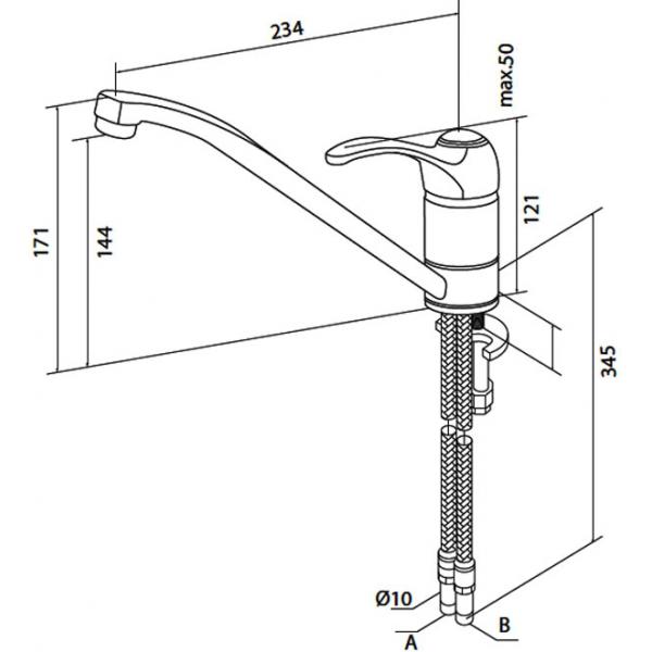 Кухонный смеситель, излив 234 мм, хром. Подвод воды осуществляется через гибкие шланги G 3/8" длиной 345 мм.
