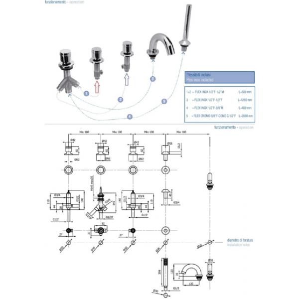 Смеситель на борт ванны врезной, состоит их пяти элементов: