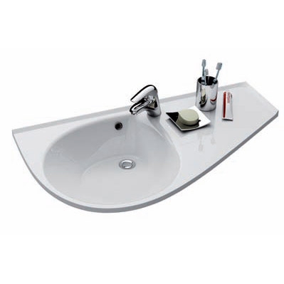 Форма умывальника позволяет разместить его над узкой стороной ванны,