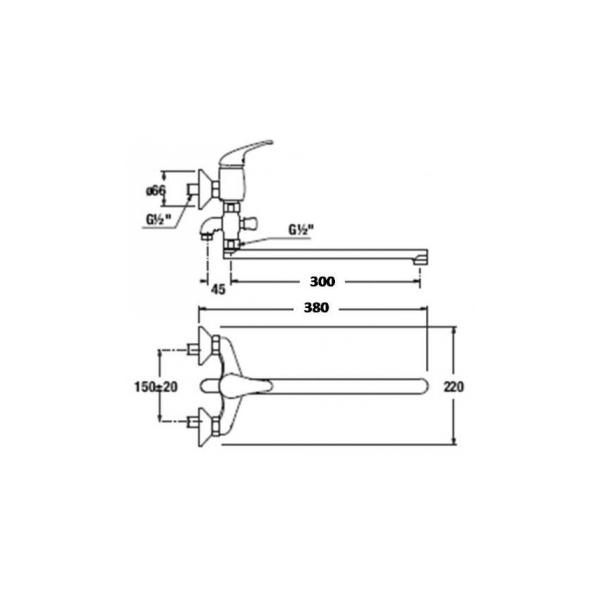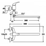 - Смеситель для ванны с изливом 300 мм в комплекте с душевым набором, керамический картридж, аэратор.
