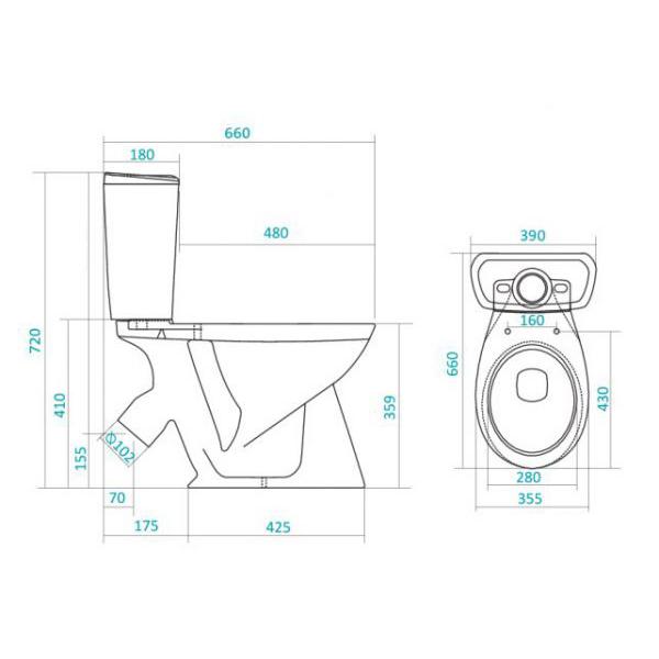 Унитаз-компакт с косым выпуском в комплекте с арматурой, жестким сиденьем и креплением.