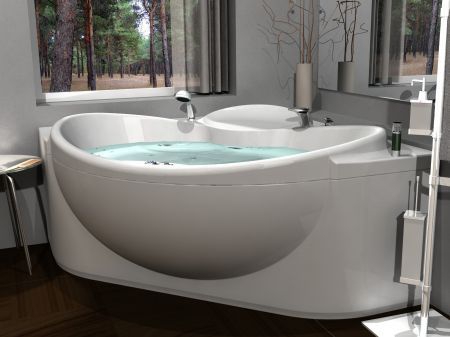 Акриловая ванна с гидромассажем, угловая. Стандартная комплектация: гидромассаж с пневматическим управлением, 12 боковых форсунок, фронтальный экран, опорная конструкция.