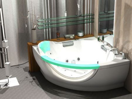 Акриловая ванна с гидромассажем, угловая. Стандартная комплектация: гидромассаж с пневматическим управлением, 6 боковых форсунок, фронтальный экран, опорная конструкция.