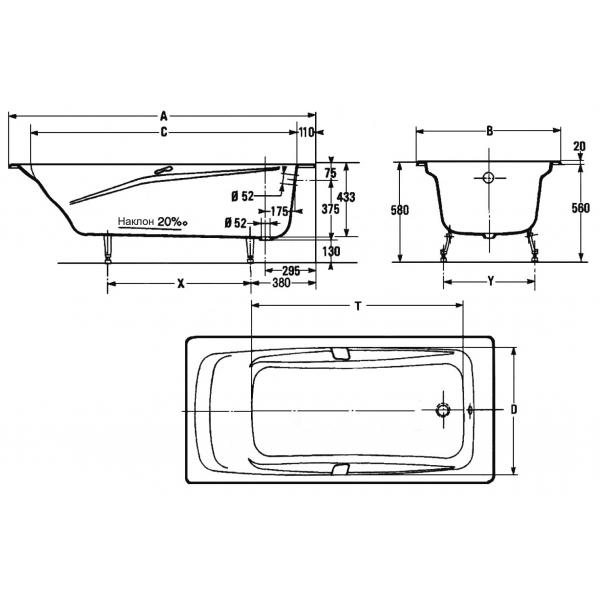 Ванна чугун Jacob Delafon Repos 160x75 Е2929 c отвер для ручек